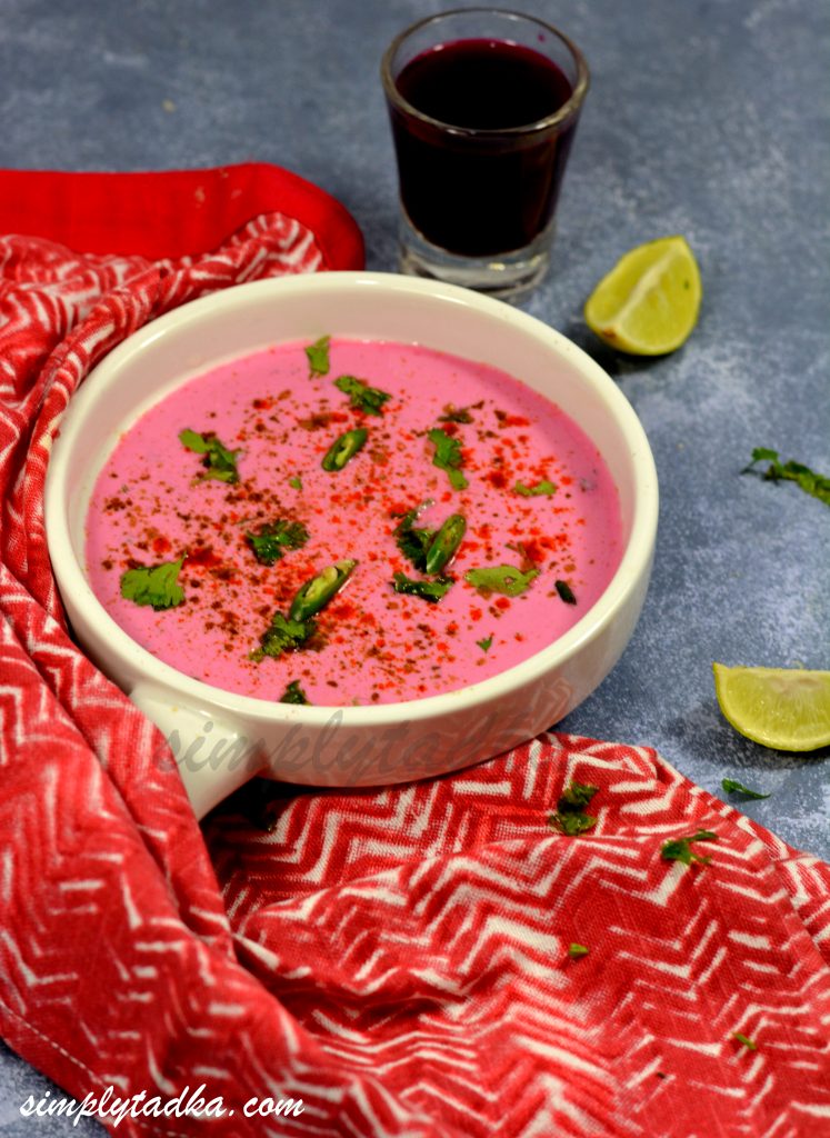 Peel and grated the beetroot and boil it with enough water in saucepan or pressure cooker till to tender. Blend it till to smooth. Now combine whisked yogurt, beetroot puree, salt, roasted cumin powder, red chili powder, green chilies, onion and coriander leaves and mix well. Keep in refrigerator for 2 hours to set. Serve chilled with main course.