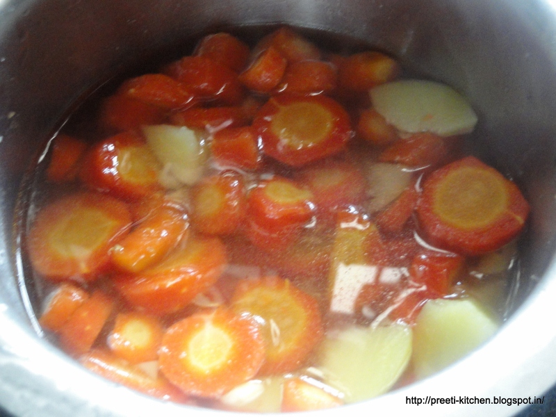 potato and carrots in pressure cooker with salt and water for 5-6 whistles.