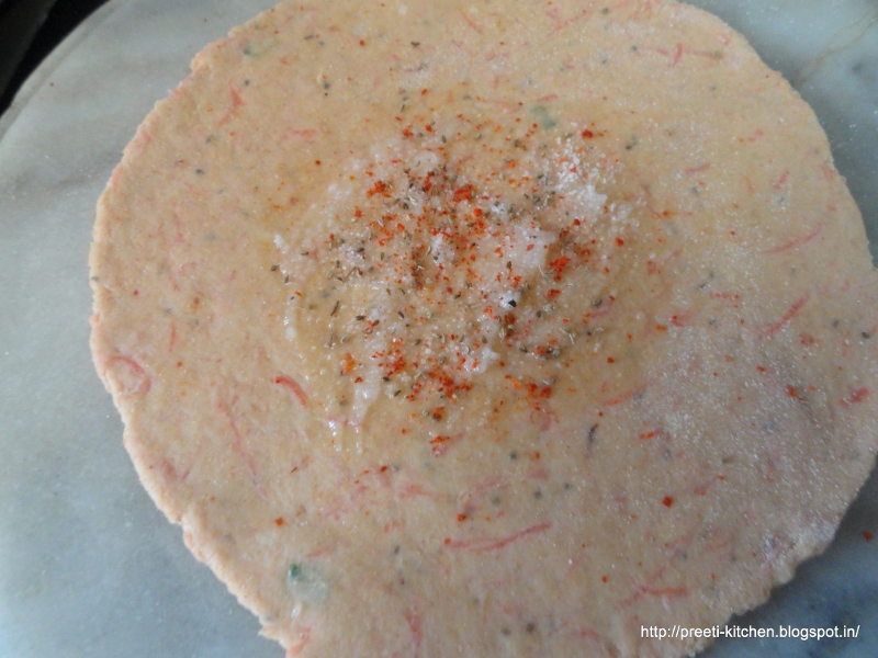Now spread ghee over the flatten dough and sprinkle salt and red