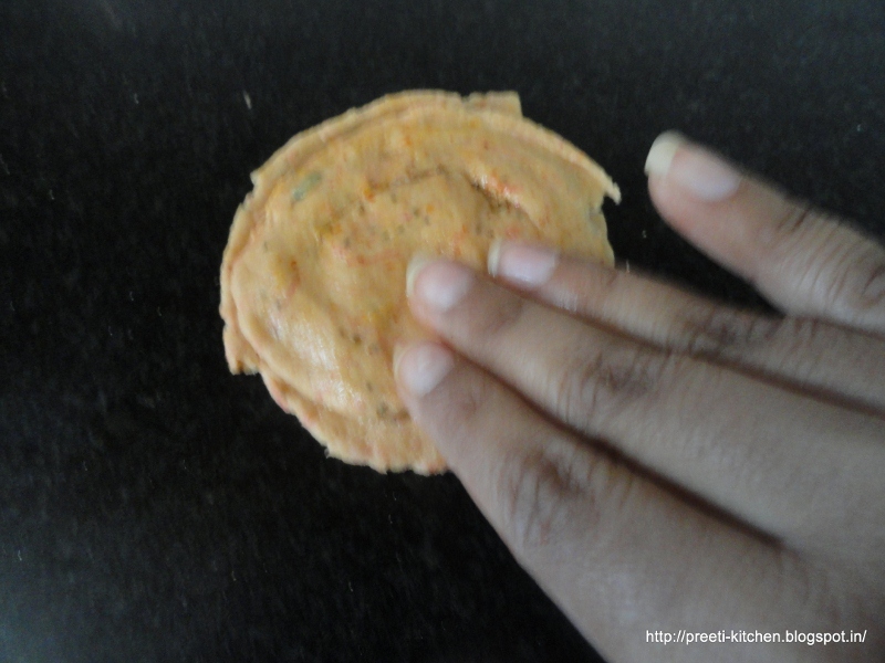 chilli powder little more on the top. Now cut the flatten dough in half diameter as picture in shown. Now