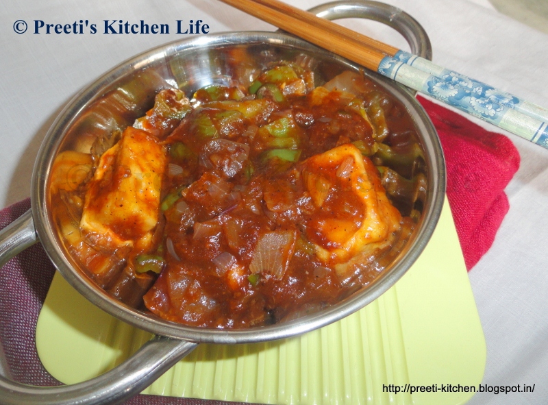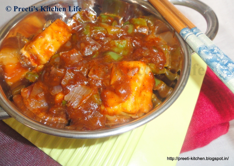 have to fry the cheese cubes and cooked in capsicum and sauces gravy with spicy