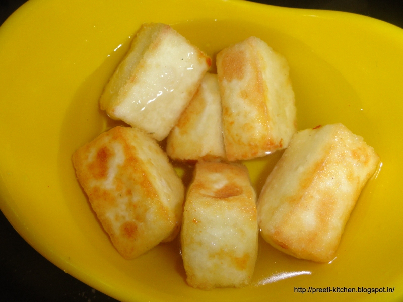 big cubes and toss into cornflour. Heat the oil and deep fry the paneer cubes