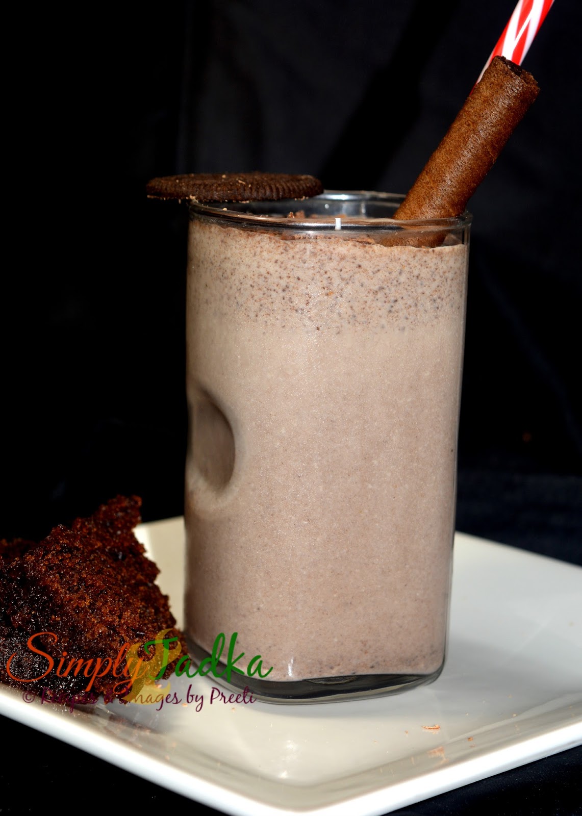 one glass of chocolate cake cookie smoothie, just like a chocolaty dessert. Add