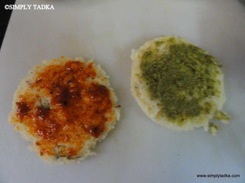 green coriander dip and pizza sauce for spreading on idli slices but you can