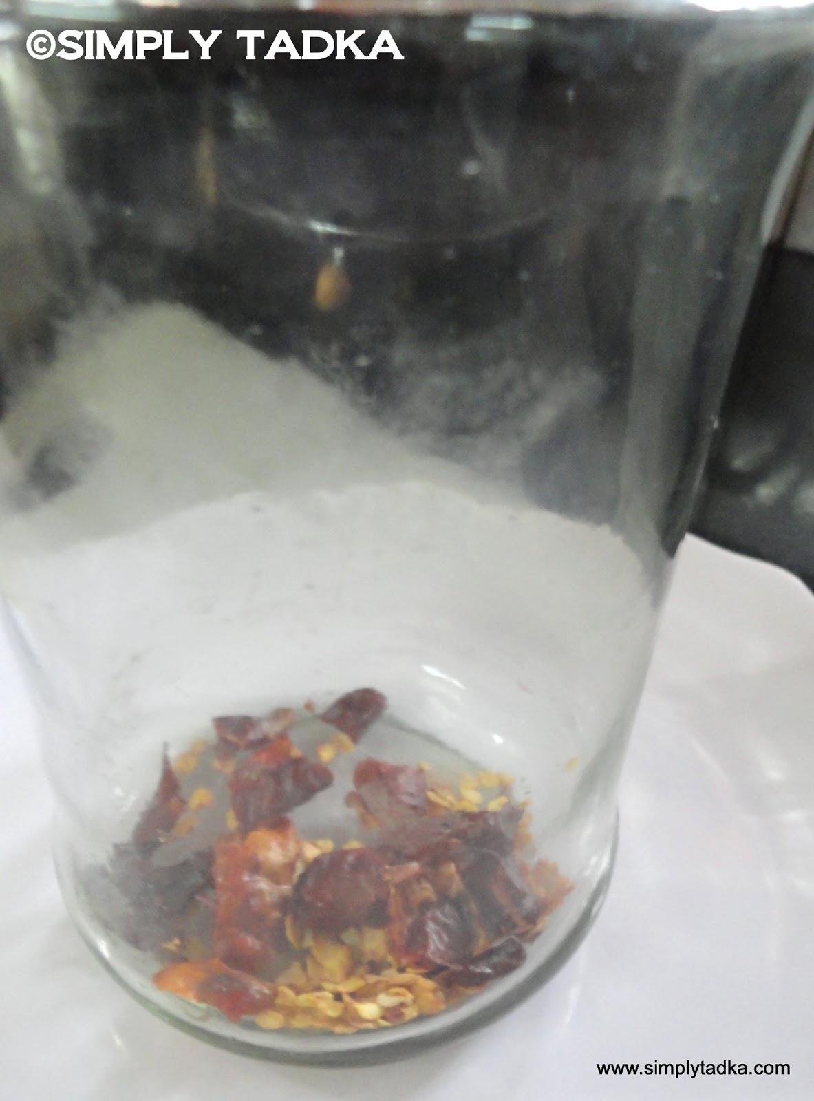 Chop the red chilies roughly and put all flakes and chili in the glass