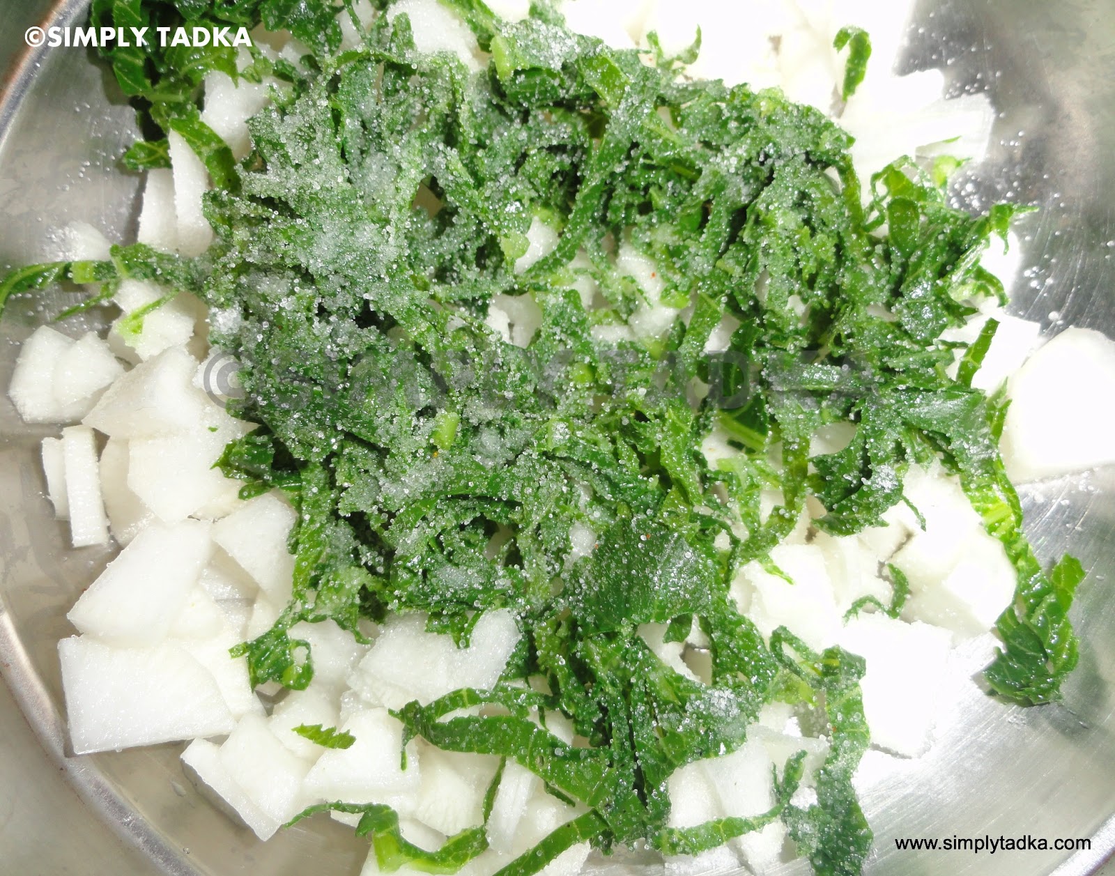 Note: Don’t waste salty water which comes from mooli and leaves. use during cooking process. Adjust the spices according to taste.