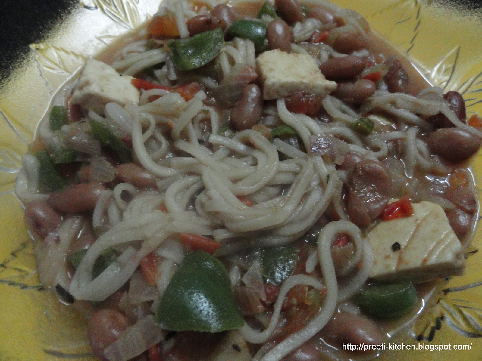 consistency. Here we use bean stock (water which we used in boiling beans). Now add paneer or tofu and noodles cook for 5