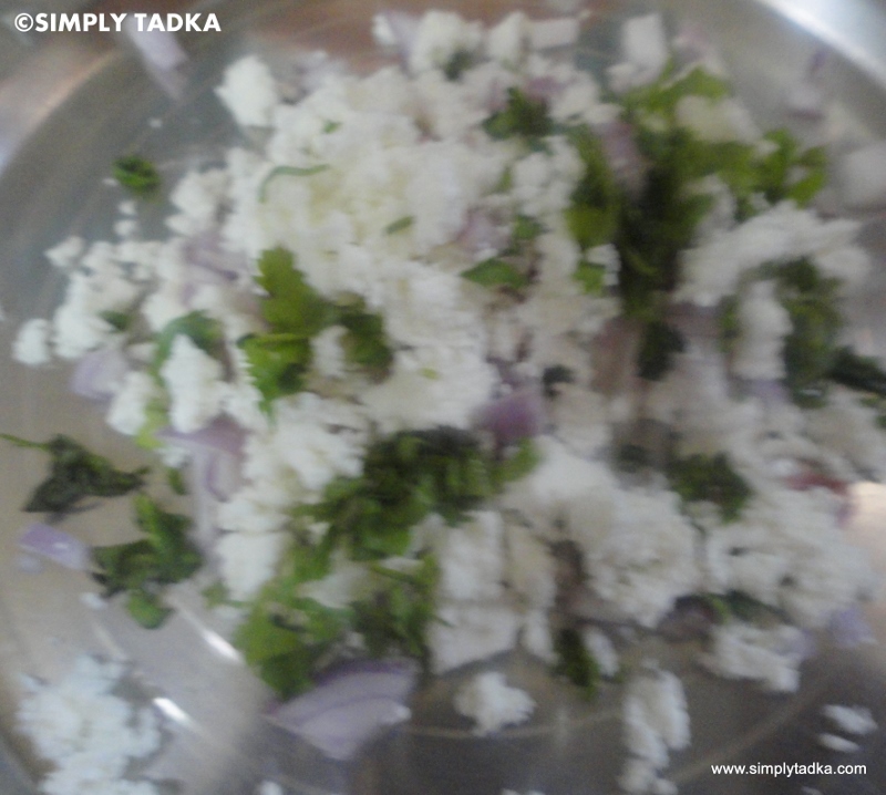 chili, green coriander and grated paneer. Add salt, chaat masala, red chili