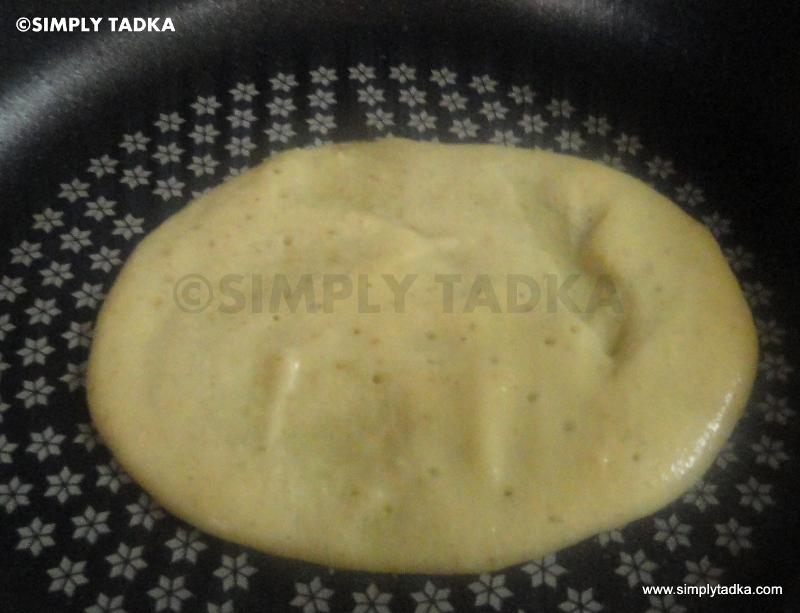 flame, when is hot enough. Grease little oil and pour one ladle of batter and
